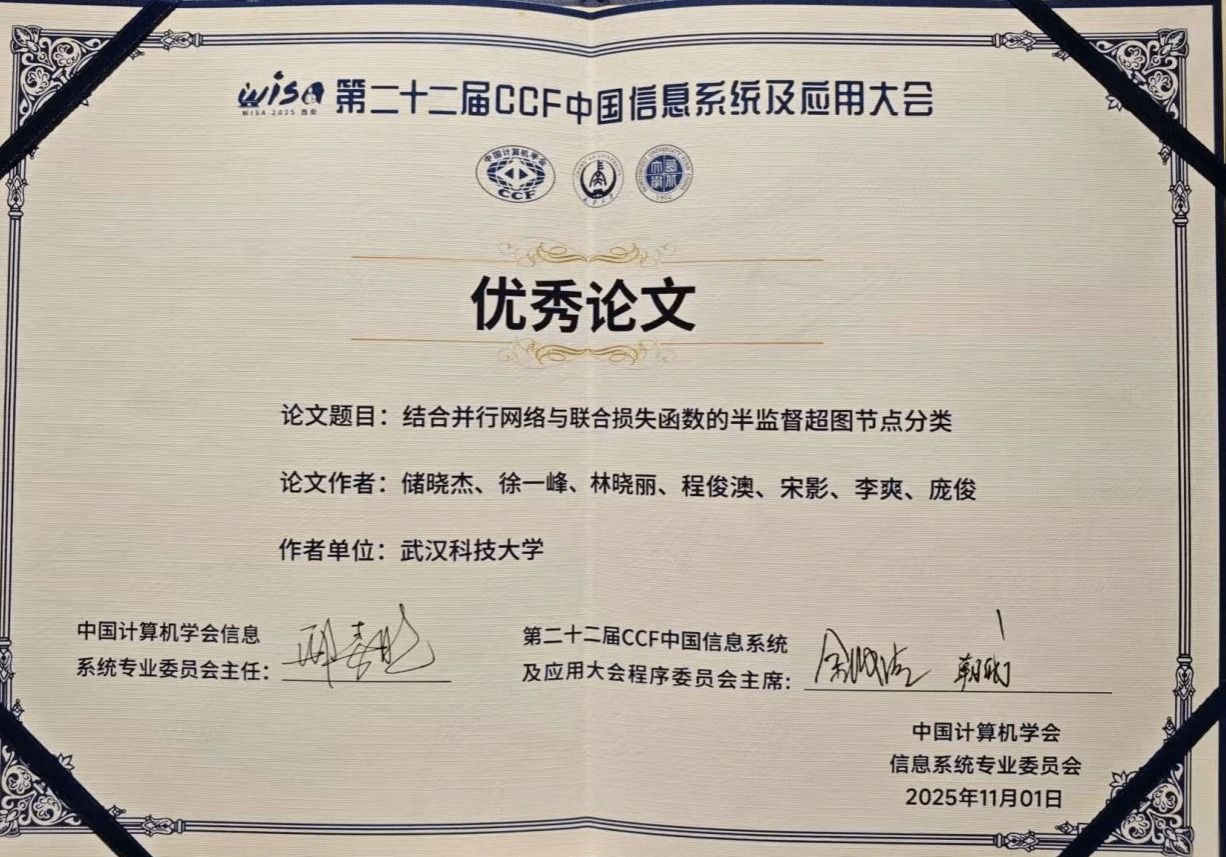 近日,在陕西省西安市举行的第二十二届CCF中国信息系统及应用大会(WISA 2025)上,公司3044永利集团硕士研究生储晓杰、徐一峰、程俊澳、宋影、李爽在庞俊和林晓丽两位老师的指导下合作的论文《结合并行网络与联合损失函数的半监督超图节点分类》,荣获WISA 2025优秀论文。大会共收到研究论文投稿202篇,录用英文论文51篇,录用中文论文57篇。最终评选出1篇最佳论文,1篇最佳员工论文,6篇优秀论文。