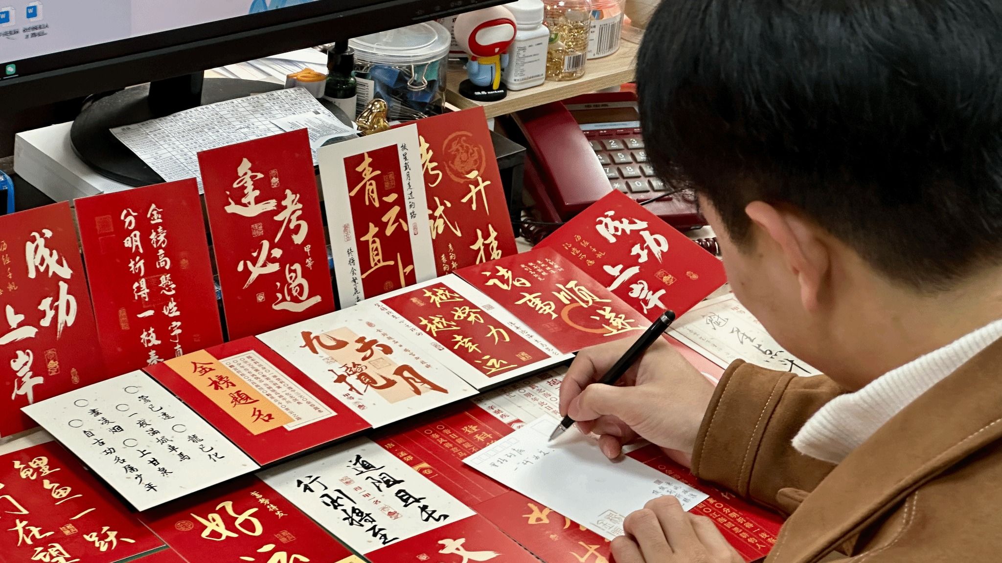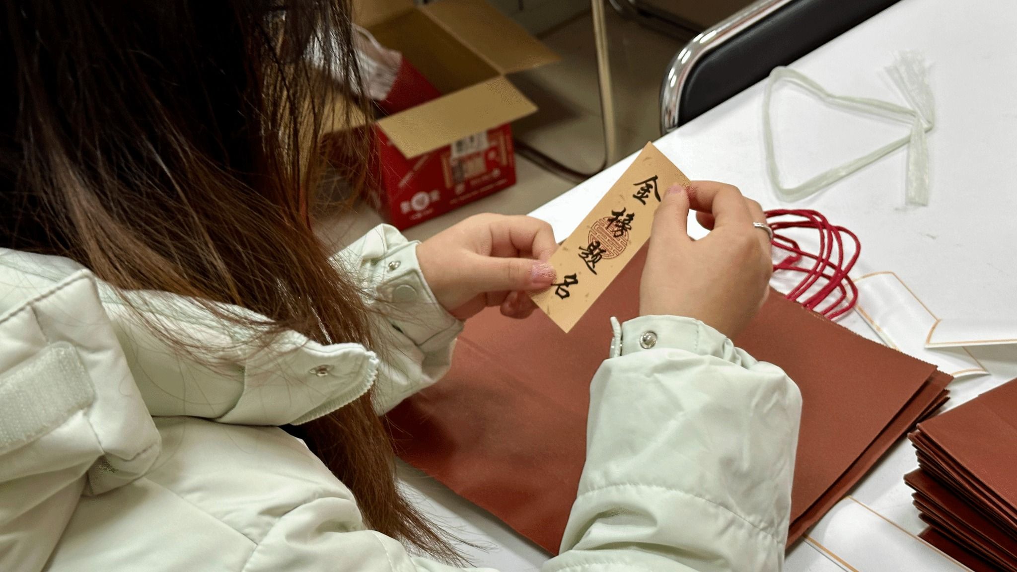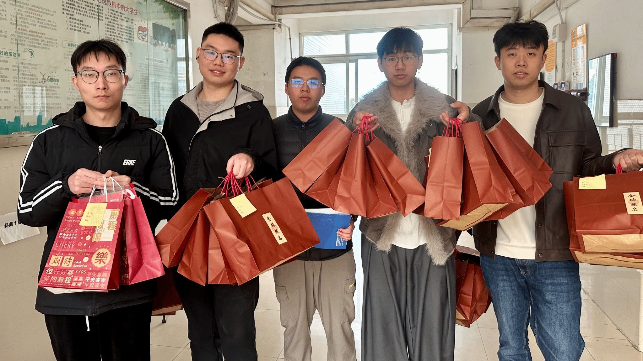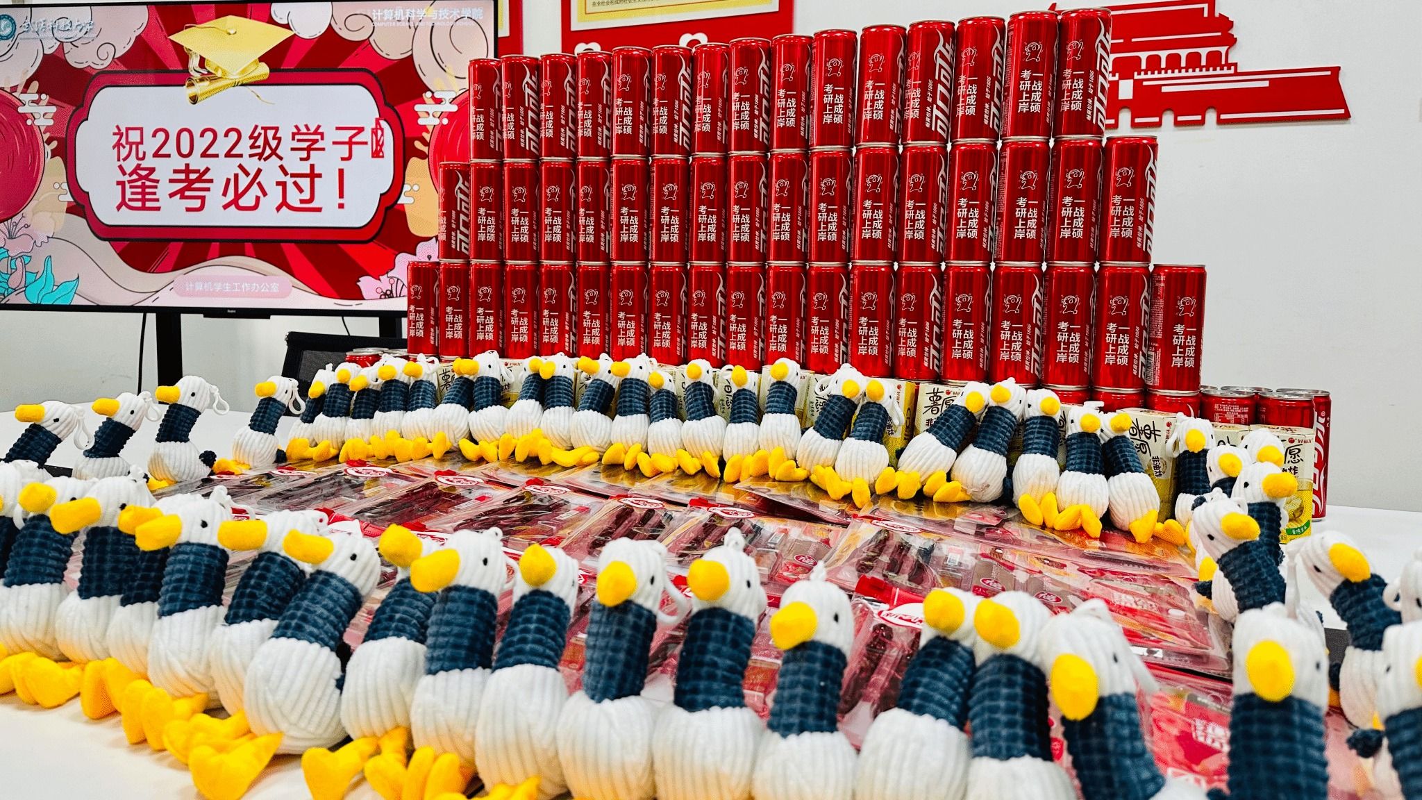 活动现场,志愿者分工协作,细致完成拆封、摆放、整理、封装等环节。公司精心筹备的慰问品兼具实用性与心意:文具袋内含考试必备的中性笔、橡皮等用品;薯愿薯片寓意“薯你心愿”;有传递着乐观向上精神的“加油鸭”玩偶;印刻着“考研上岸,一战成硕”的专属定制可乐;更有公司领导、老师与低年级学子共同手写的加油贺卡,承载着师生间的牵挂与期许。与此同时,曾宪森老师与志愿者们同步前往考研自习室,悬挂“逐梦前行,全力以赴”等励志标语,精心打造“上岸墙”——39所985高校及武汉地区知名高校的校徽醒目陈列,让自习室成为充满希望与力量的备考“能量场”,助力学子们在冲刺阶段凝心聚力。