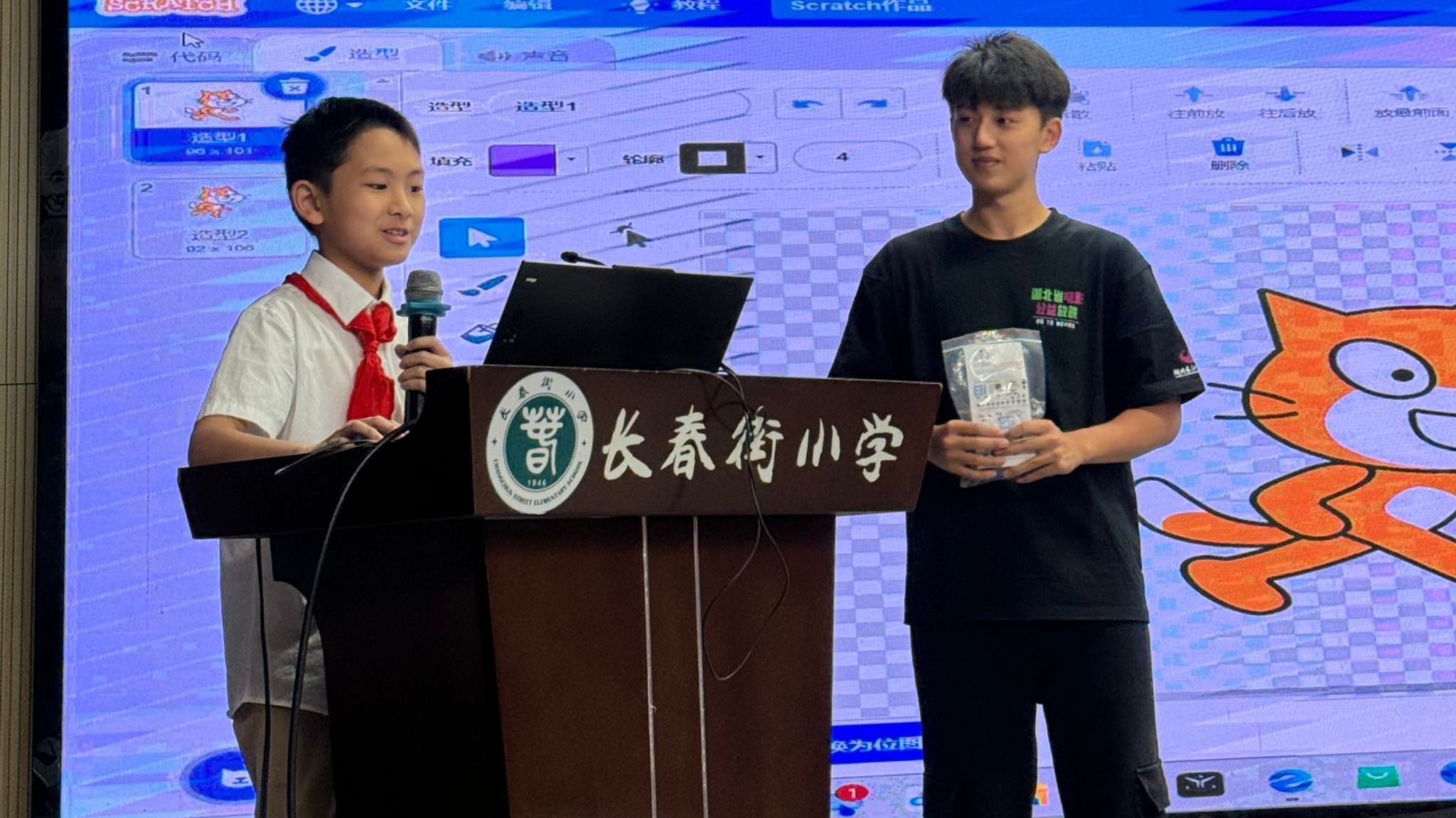 活动现场,3044永利集团老员工科普宣讲志愿者孙昊羽首先为同学们介绍了电影《流浪地球2》中的太空天梯和月面机器人“笨笨”狗,讲解了其中的物理现象和人工智能技术,然后以坐飞机、过山车和宇航员的太空生活为例,为同学们解释了超重和失重现象及其应用,以AI绘画、AI配音和老照片修复为例,为同学们介绍了人工智能在生活和电影中的应用。孙昊羽还结合自己所学的计算机专业知识,引导和鼓励同学们学习少儿编程,培养计算思维和创新能力。在编程体验环节,一位“小小程序员”上台很快就敲出了目标程序并为同学们现场讲解,展现出良好的编程逻辑思维与动手能力。