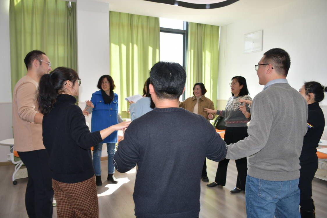活动开始,参与人员围成“同心圆”,将手搭在前人的身体上,伴随着悠扬舒缓的音乐,并跟从胡老师的口令,开始了第一个小游戏。“摸摸你的头啊,烦恼快快走啊”“捏捏你的肩啊,轻松一整天啊”,一句句互相鼓励的话语拂去老师们工作中的疲惫。方钟明老师表感慨:“听了这些轻柔的疗愈话语,感觉自己的疲惫都被净化祛除了。”