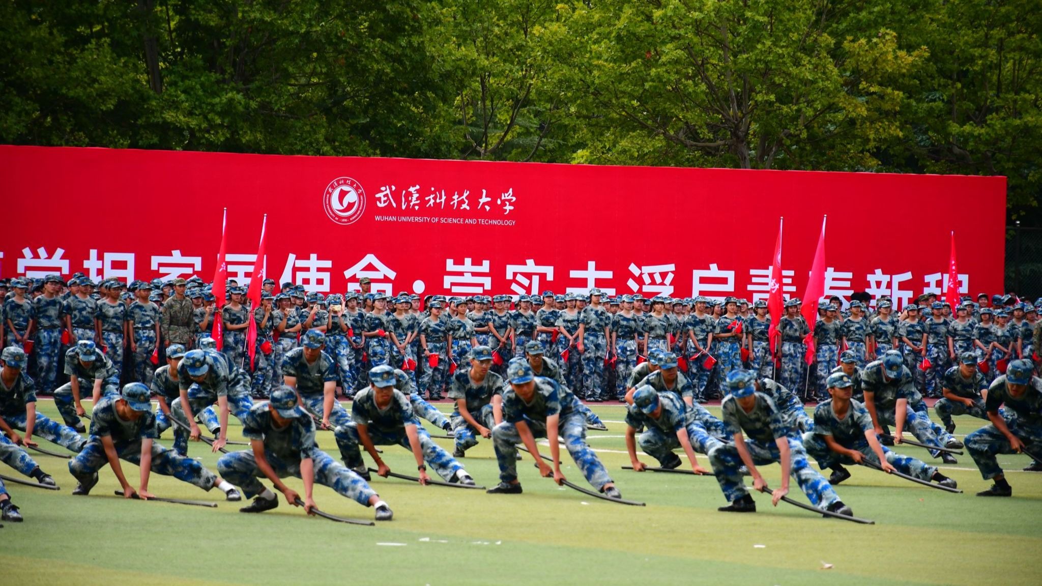 在军事技能汇报表演环节,由公司参训员工组成的特色方阵——大刀队与棍术队展现了扎实的训练成果。大刀队动作刚猛、气势如虹,棍术队招式流畅、虎虎生风。队员们动作齐整有力,招式利落干脆,以稳扎稳打的表现与昂扬的斗志,赢得全场师生热烈掌声,尽显计算机学子过硬的军事素养与默契的团队协作精神。