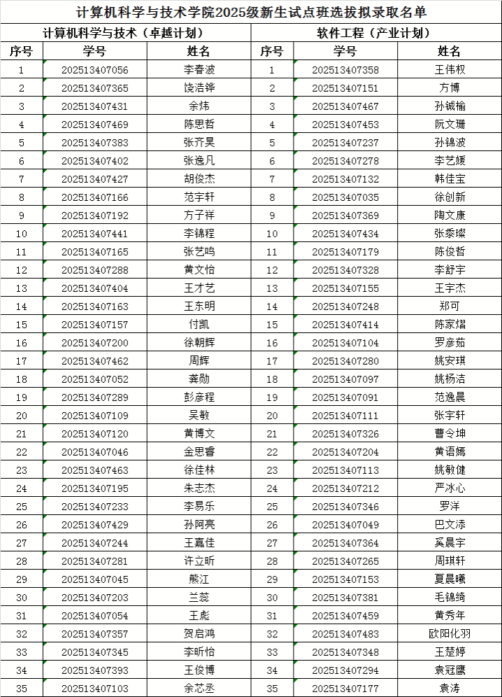 根据《3044永利集团2025级新生试点班选拔考核工作安排》,公司于9月22日组织了新生试点班选拔的考试。根据员工考试成绩和员工志愿,择优拟录取35名《计算机科学与技术(卓越计划)》员工,35名《软件工程(产业计划)》员工。无特殊原因,拟录取员工不得主动申请退出!现将拟录取名单公示如下: